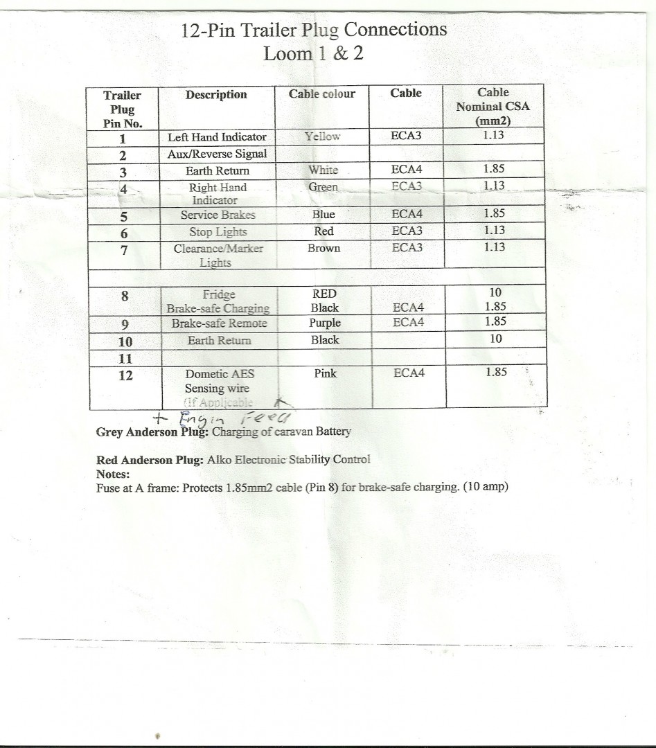 There is no standard for wiring AES fridges through a 12 pin plug/socket. The standards only go as far as the navigation lights on pins 1 - 7, Pin 8 for battery feed, pin 9 for the fridge 12 V element and pin 10 heavy duty earth. Where only 7 pin plugs are used, pin 2 is thieved for the fridge hot wire, however under the standards it is allocated for the reversing signal (or reverse lights.) If you go to an auto electrician with your tug and just ask him to wire the socket up they will often wire pin 2 to the reverse lights.