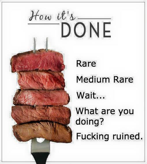 As an old chef I'd start at the top Rare maybe go to med rare but Blue has been omitted, shame.