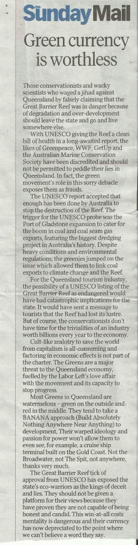 I am proud to consider myself as a greenie and I take objection to the ill informed and ignorant who constantly criticise those seeking to preserve the natural environment for ours and future generations to enjoy. Imagine, if you will, the state of our land had the greenies not emerged and not protested against the wholesale destruction of our natural wonders in the name of progress. Now its the turn of the Great Barrier Reef to come under scrutiny and its not looking all that good -www.abc.net.au/news/2014-09-03/how-healthy-is-the-great-barrier-reef-fact-file/5649810. Many expressing concerns about the long term health of the reef are not just the dole bludging lefty green nutjobs as portrayed by many of the contributors to this thread. Eminent and internationally respected scientists have also been raising concerns based on scientific research by people who actually live in Queensland and some even on the the reef. Personally I will listen to those qualified to give a researched, objective opinion rather than newspaper editors who aren't really qualified to comment on anything.