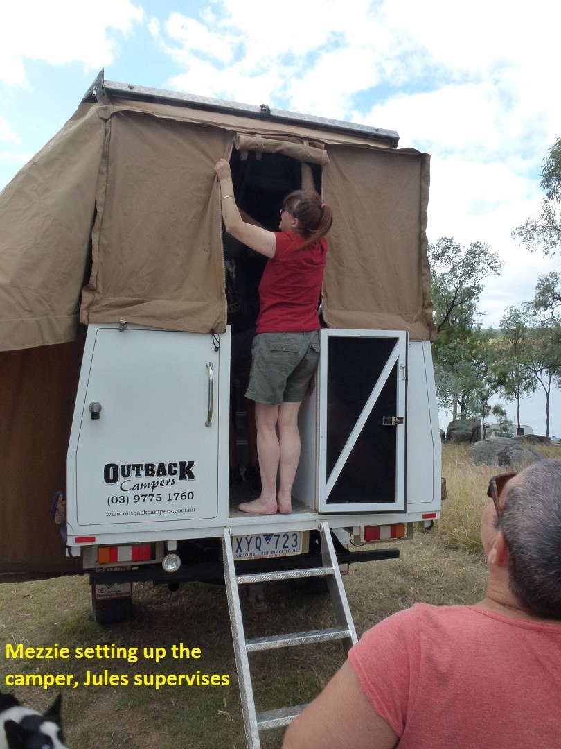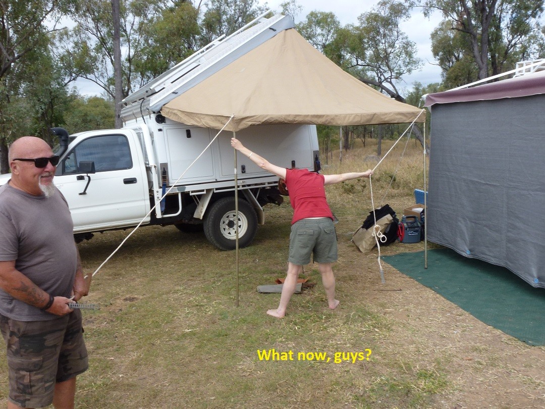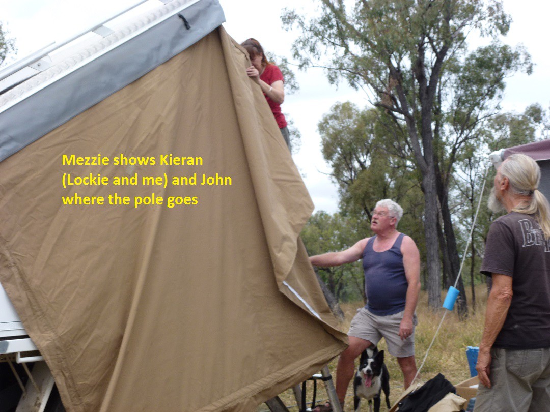 John's visitor Mezzie arrived today with her impressive slide-on camper. The afternoon's entertainment came in the form of Mezzie and some willing helpers setting up her awning and annex, which was finally achieved after several attempts. John gallantly surrendered some of his annex space so that Mezzie's annex could be secured.