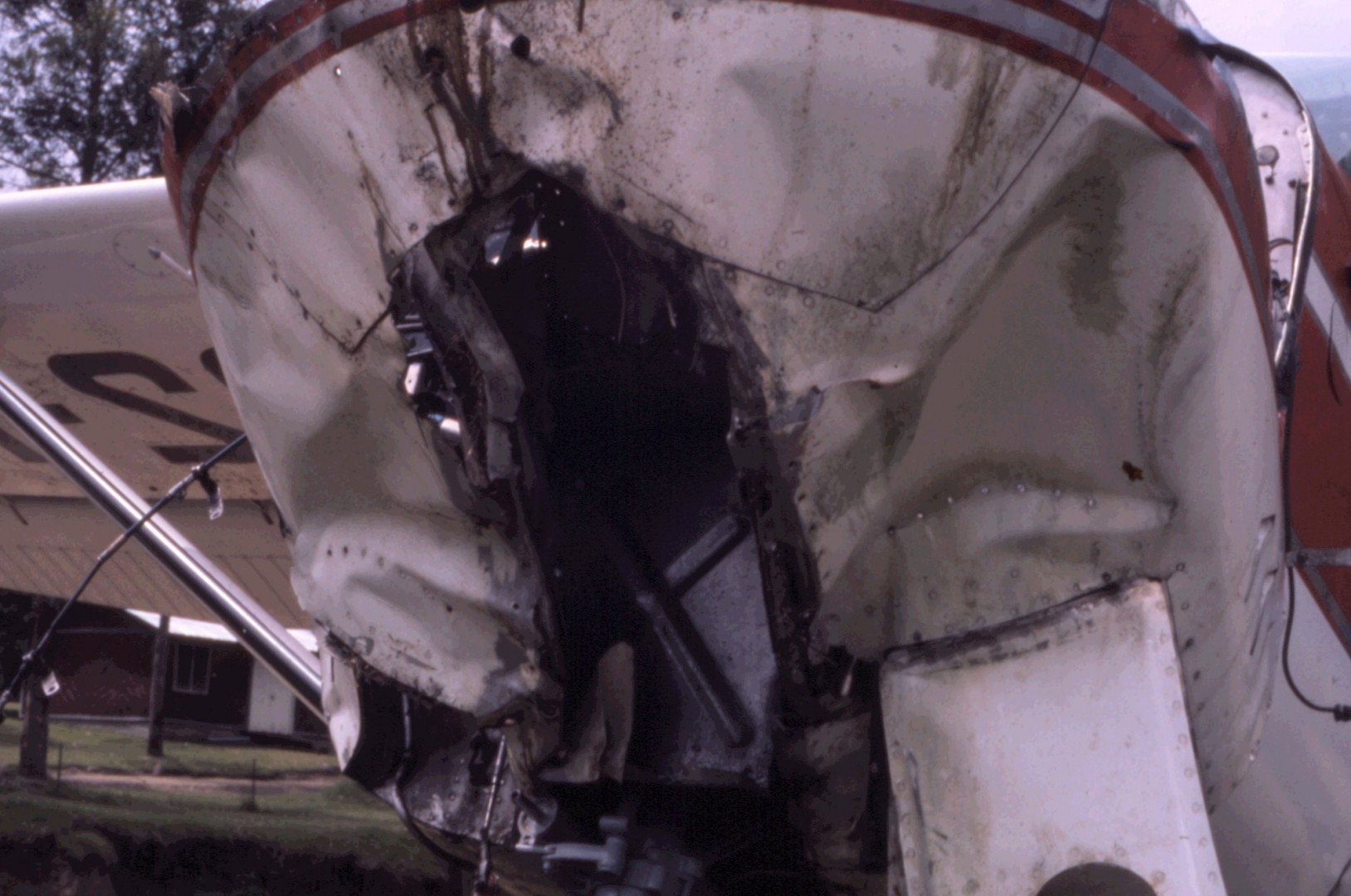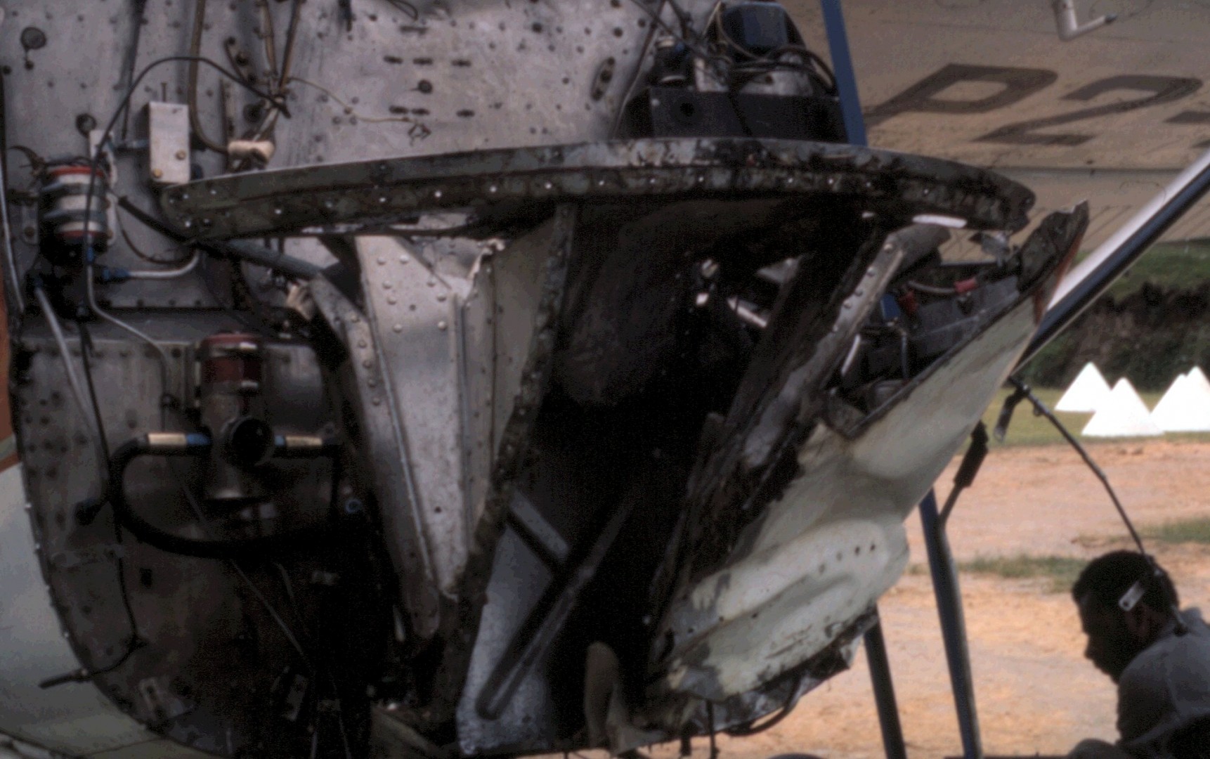 With the engine removed, its all pretty much crunched up. Working from day break and well into the night, we drilled out the rivets, bashed everything to its approximate shape and bolted or pop riveted it back together. All we had was a generator and a couple of electric drills.