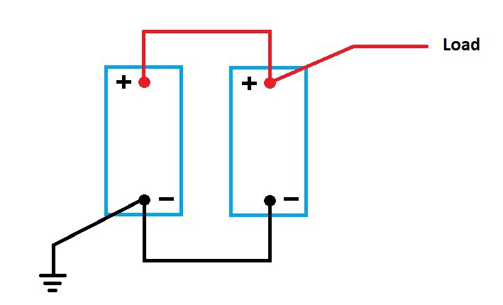 Doug, think this is an example of "balanced" wiring - it's how my "house" system is configured. Both batteries connected in parallel with load connected to positive of one battery while return ground is connected to the negative of the other battery.
