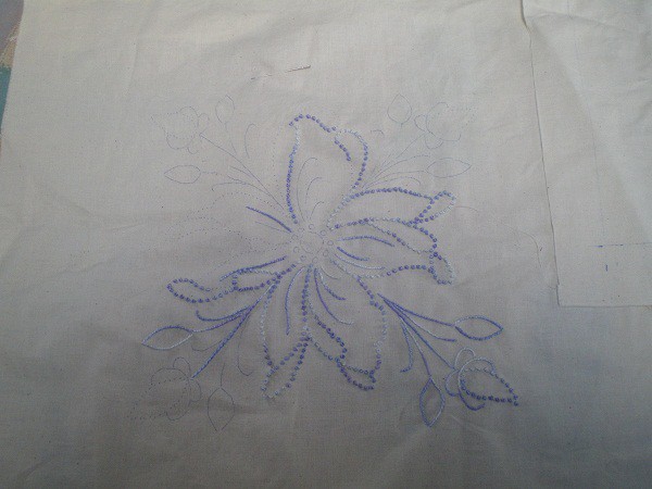 Good idea Nomes. It would be nice to see work in progress. I'm not crotcheting at present, but working on a candlewicking quilt. It will take ages before it is done, so I'm posting a photo of one block. Brenda.