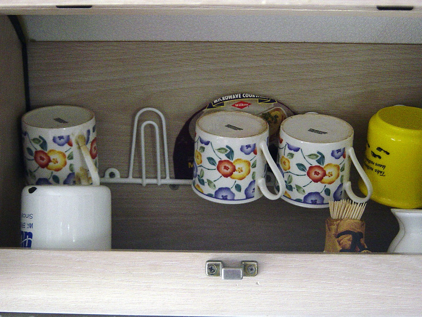 Most crockery is held in a series of racks that I made from $1 plate drying racks that I got from a hardware store. A few noodle boles are stored on a shelf covered with non slip matting.