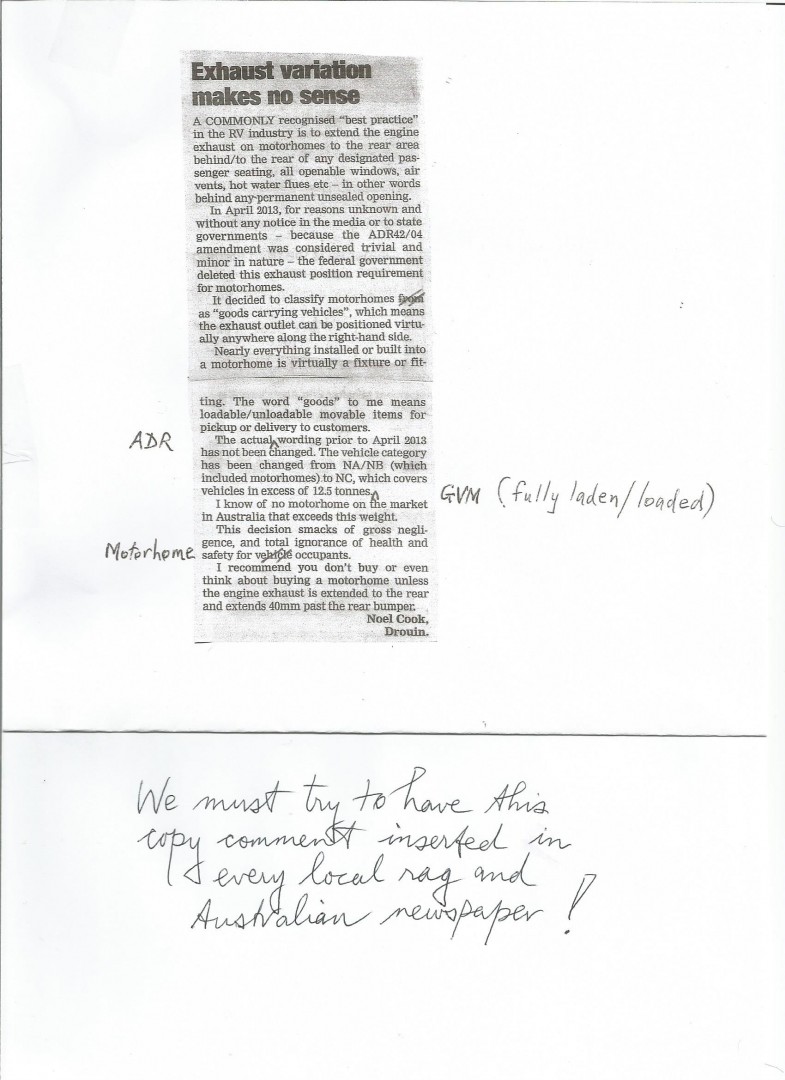 Gee,this ADR change was slipped through quietly and unannounced by the previous federal government in April 2013! What a disgrace? The commonly recognised "best practice' in the Australian RV industry for more than 40 years has been to extend engine exhausts to the rear area behind: all rear passenger seats, HWS flues,airvents,combustion air intake of accessories - like heaters etc,240V generators,behind virtually any permanently unsealed openings. Why change it? Unbelievable! I put an article in my local rag. Apparently the UK and Europe do NOT have to extend their exhausts to the rear! So Labor thought it'd be a good idea at the time if we were forced to do the same! But there is no medical or scientific evidence to support this deletion decision? The Feds believe because Euro 5 emission standards are so stringent breathing in diesel fumes is NOT UNSAFE! C'mon folks email the Commonwealth Ombudsman(ombudsman@ombudsman.gov.au) and demand reversal of this stupid idiotic non-sensical ADR deletion slipped through without any vote by every State and Territory Transport Minister as required by the rules.