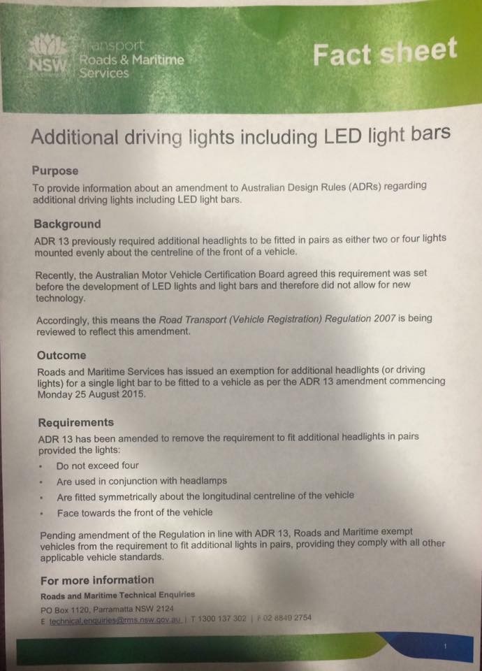 Strange but I was talking to a chap in Derby not so long ago , he was saying (hear say again ) that someone was pulled over by the police in WA and told to remove his single light bar ( as I have) as they are supposed to be in pairs . All he did was get some gaffa tape and wrapped it around the light and solved the problem .not sure how true it is though.