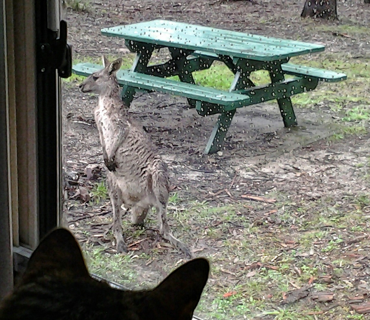 Frangipani, Thanks for the encouragement. I did meet 2 lovely ladies who were my neighbours in a motorhome for a few days and also a fellow Goldstream owner couple with a cute dog who got rather excited when she saw me walking my Purr Baby (cat) on her harness. Talking about exciting neighbours. .... well my Ranni was vibrating with excitement when she looked out of the windows this morning....see attached photo for the reason why! Currently at Scrubby Creek Rest Area 20km south of Eden NSW.