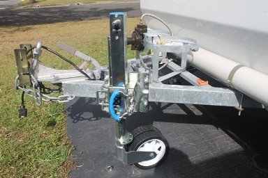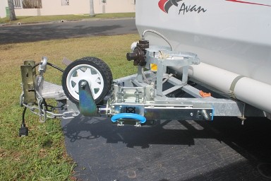However, in the 3 years we've had the van I have never been happy with the small 6" jockey provided by Avan - in around 20-30% of sites it tended to dig into the grass or sandy site base. As the new power movers create a fair amount of 'shove' in moving the van, I decided that the old jockey had to go. I fitted one of the new ARK heavy duty off-road units - twin 8" wheels with sealed ball bearings, 90 degree trailing yoke, 4 mounting heights with a full 250mm height windup, side wind type with removable handle, and can take 750kg down-force - a really HEAVY DUTY unit - although it could be considered major over-kill for the Aliner, it just breezes across grassy ground - doesn't dig in anymore. It was worth the extra cost - it will do us until we reach the age and health were we have to stop vanning altogether.