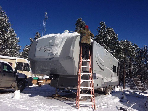 Snow is another problem in USA. Photo taken at older son's place in mountains of northern New Mexico at about 2300m. Just used one of his ladders and a broom. I had climbed the rear ladder to roof but it was so slick that i would slide just sitting down, a bad idea at age 75.