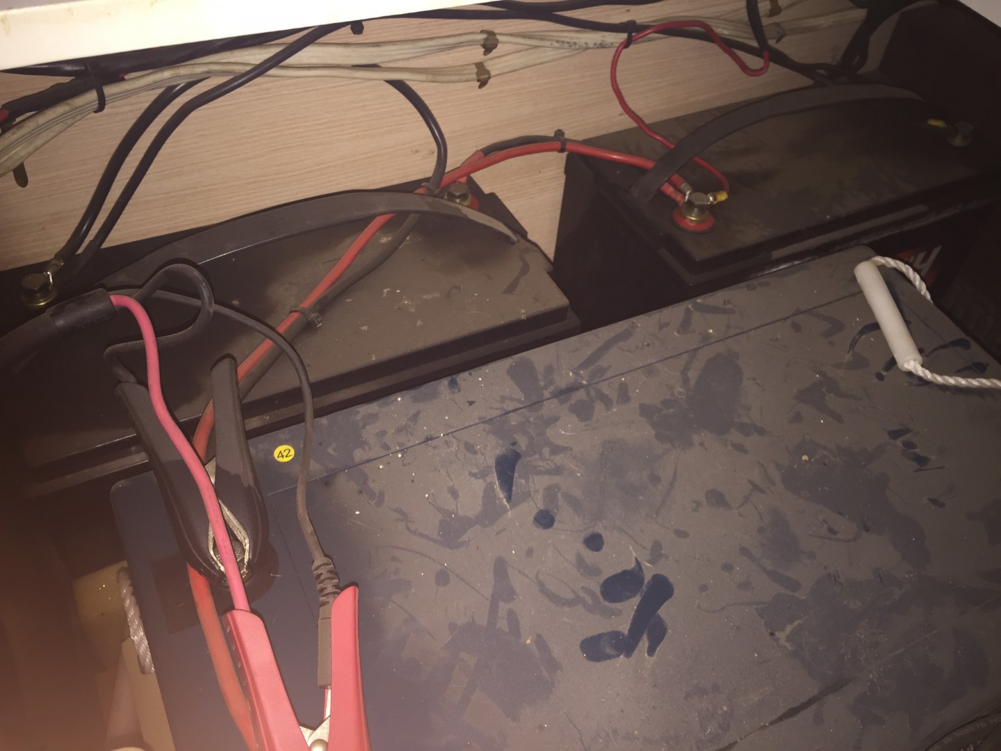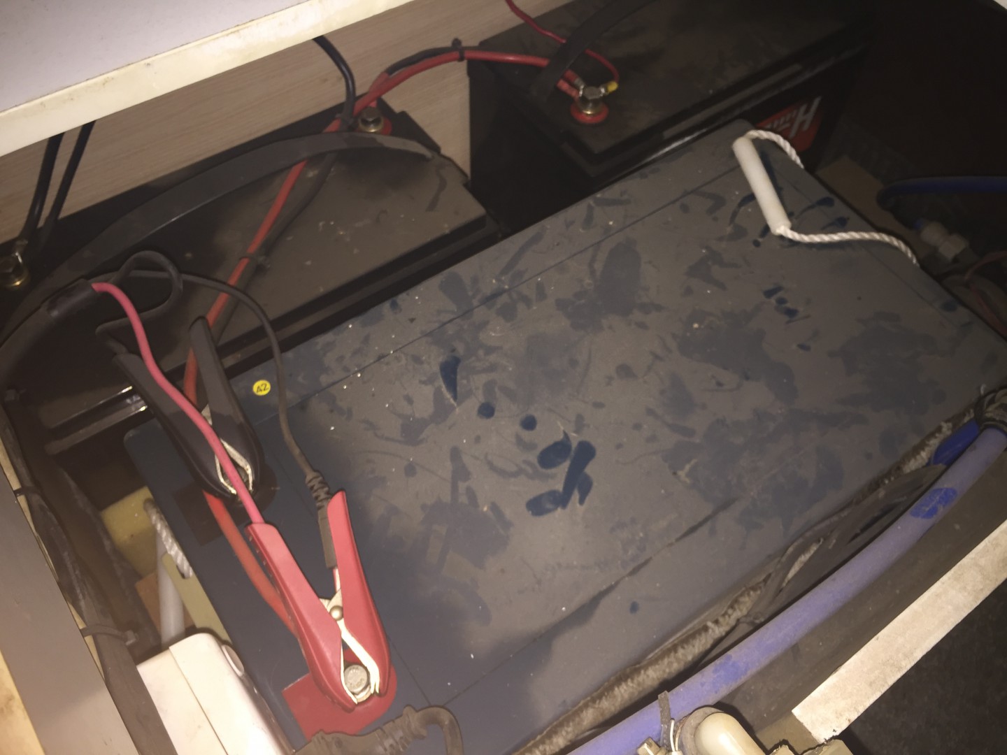 . It's got two standard house batteries another huge green battery thing connected together but I have no idea how this all works..