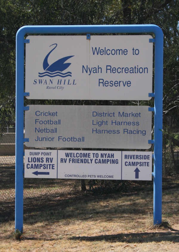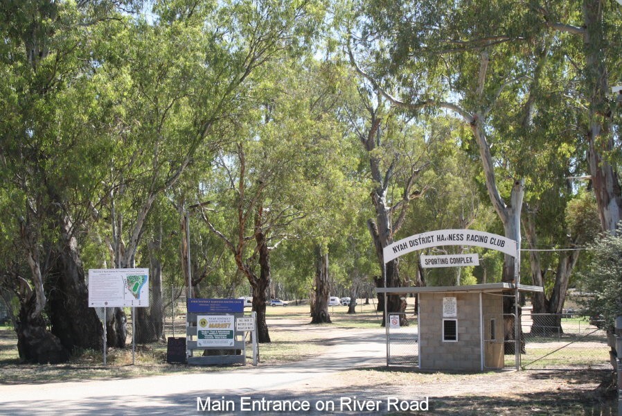 Nyah Recreation Reserve is situated at the Nyah Trotting Track and sports complex on River Road, which not surprisingly is in Nyah.