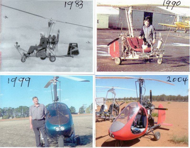 Pics below show VW powered in 1983, Rotax 2 stroke 1990, and Subaru for the cabin machines. In 2004 I flew the red cabin machine from Ballarat to Alice Springs and back for our Gyroplane Nationa Championships