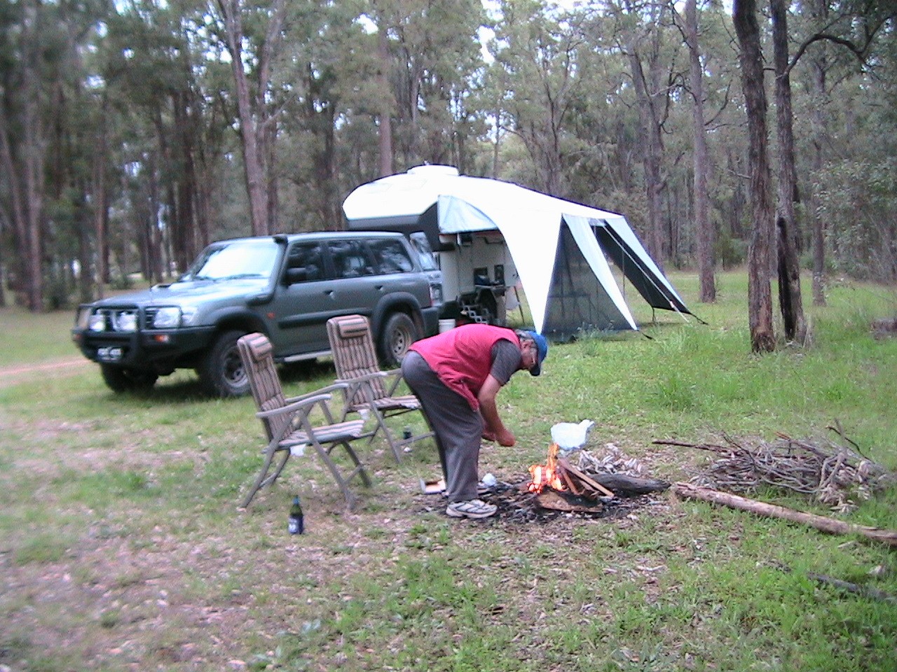 In 2008 we moved on from our Kimberley Kamper Trailer to a Kimberley Karavan. Our first camp in our new home on wheels was at the nice freebie on the bushy common in the NSW town of Broke - mainly because we felt that it reflected our financial status after the big purchase. We certainly enjoy the increased comfort provided indoors by having hot & cold running water, toilet, shower, airconditioning, diesel heating, TV (hardly EVER watch it), diesel cook top and microwave (which we usually store our medication in!). We appreciate the ability to camp anywhere almost indefinitly given the onboard solar panels, generator backup and facility for pumping water into the second tank from any source (although we have managed so far to only use good quality water in both tanks).We also like the option of hooking up the external shower nozzle so we can appreciate our surroundings as we bathe. HOWEVER, our preference is still to spend most of our time outside, under the awning, or tellling tall tales, sipping the odd cold wine/beer beside the camp fire preferably at some pictureseque, remote, awesome part of our beautiful country. When fully laden with fuel, water, gear etc the KK weighs about 1 ton. We towed her in the beginning with our dear old Nissan Patrol, called Betsy, who had given us incredibly faithful service towing our old Kamper all over Australia. After a couple more years, we decided to put Betsy out to pasture, so to speak, and upgraded to our new Nissan Patrol, aka 'Linus' (so named because they were the shares my husband had to sell to pay for her).