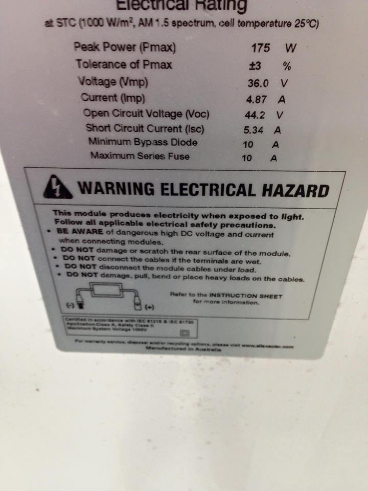 1. 300 watt mono solar panel --- 22.5 open circuit volts, 18 volt (Pmax) --- 17.58 amp short circuit current, 16.67 amp current (Pmax) --- paid for and on the way