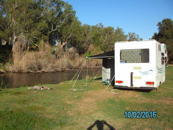 Camp right beside the clear fairly fast flowing McQuarie river, or alternatively up on the top of the high bank, good Sunny or Shady spots there for a few hundred metres. Good for internet, phone & dogs. Not much in the way of facilities apart from one long drop dunny and a a few bins. Dump point in Wellington 15-20 kms away. 14 day limit. Great for paddling, bathing, or kayaking, but don't lose hold of anything that floats or it will disappear quickly! Don't know where the 'falls' are, but in February at least this section is clear beautiful water, more than knee deep at the edge. Could be a popular swimming hole during School holidays I suspect, and gets busy at weekends. Currently only the ducks and ****atoos and 4 other rigs here!