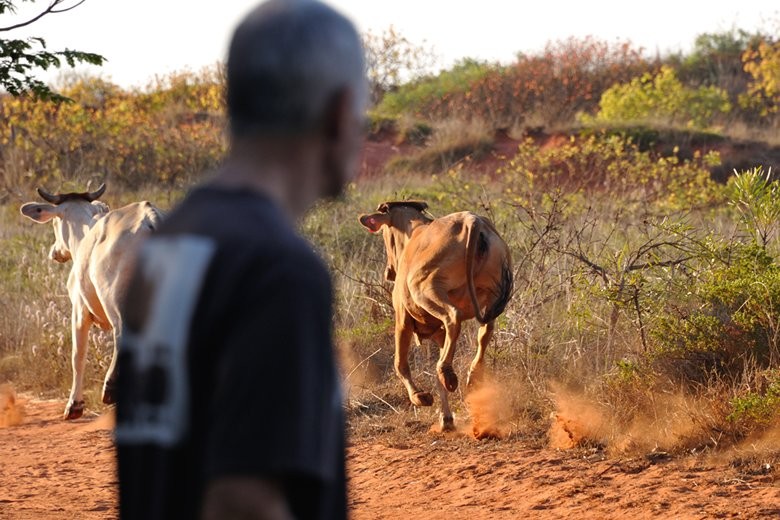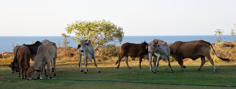 Some shots from our last stay. It was HOT! Fruit Bats were suffering and cattle were coming in to the camp area to drink from the sprinklers. Sadly we found four dead bats after one hot day, and one flew to ground under the spray from the sprinkler and licked water from its wing membrane. It survived. A couple of shots show the Managers, Steve and Gary pushing the cattle away from campers. The cattle did not look threatening at all, but they are not predictable so it was best to move them on.