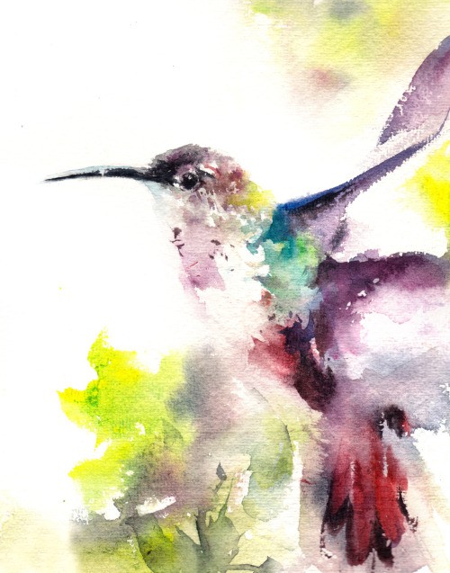 Watercolour of a hummingbird in flight.