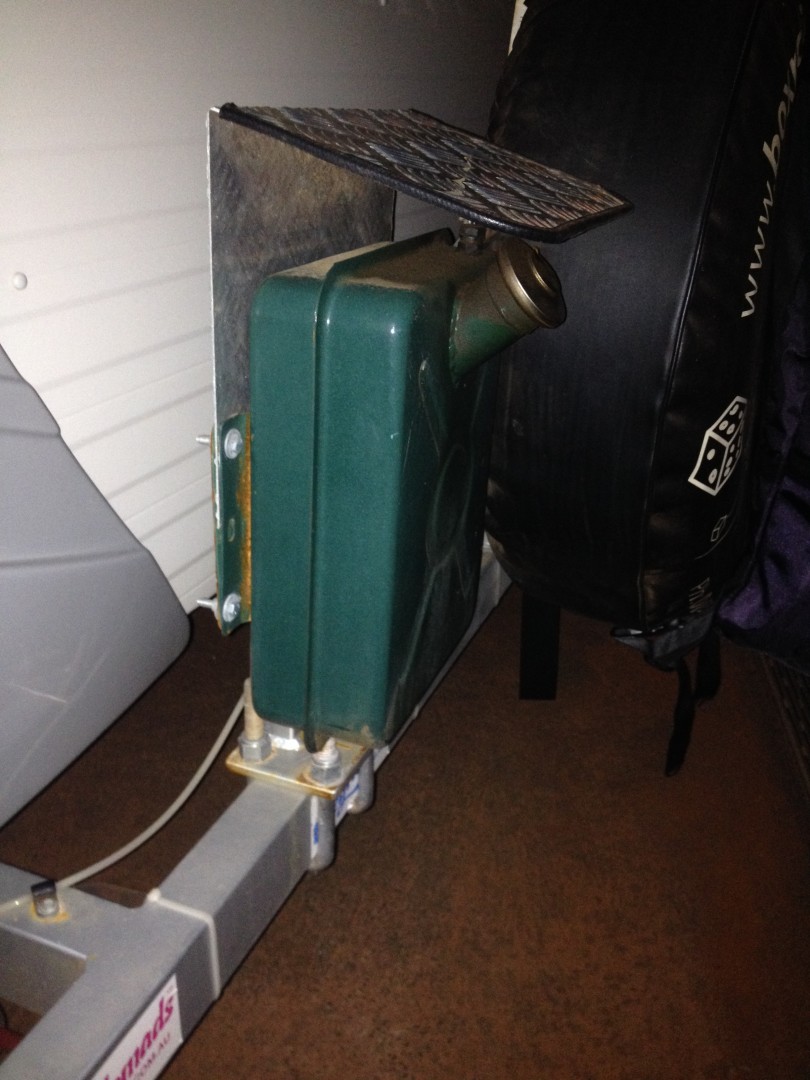 I had my fuel tank, a red 5L jerry can strapped on top of a battery in the front boot. It was a simple matter to unstrap it & lift out of the boot for refilling.