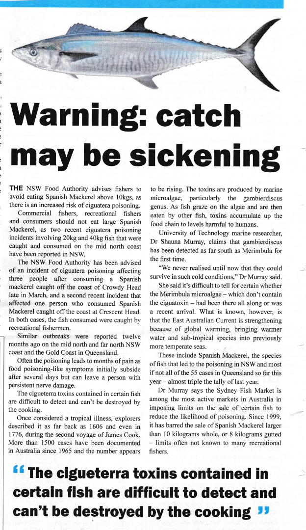 Actually some truth to be said in big Spanish Mackeral supposedly having a possabillity of ciguatera. Have Fished these fish for years and caught in all sizes with no problem at all and think the further north QLD) you head the greater the risk especiall Northern territory etc..