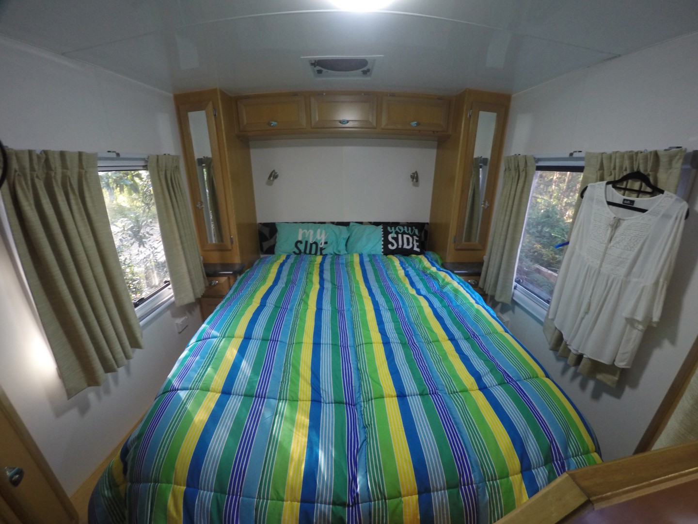 The bits I really appreciate are to do with its build and stability, which is mostly what contributes to its weight, as is the case with many off-road vans. It has a 6" dual beam hot dipped gal chassis, a screwed and glued timber wall frame bolted to the chassis, and a one piece fibreglass roof on a tig welded alloy frame. All walls and roof are fully insulated. Overhead furniture is bolted in place and the base furniture is screwed to the wall frame and floor. It's got 3.7T Cruisemaster independent trailing arm suspension with Alko ESC, 12" off road electric drum brakes and 16" alloy wheels with General Grabber AT tyres and 2 spares. We haven't dragged the van over any real serious terrain yet to test all this, but the previous owner took it to the Flinders Ranges and said it took a hell of a pounding and never flinched. So hopefully the build quality will see us through many years of reliable travelling.