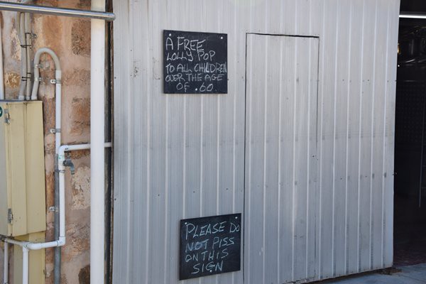 The attached pic was taken at one of the many small vineyards in Clare NSW. The blackboard and chalk writing was done by the winemaker/owner (in his late 60s) who has a very dry (like some of his great wines) sense of humour. He spun the story that his wifes little fur ball kept ****ing its leg on the main shed door and the liquid came under the door. He gave his wife the option of the dog goes or he does. He decided to stay and content himself with the sign instead. And yes, they had chuppa chups in a big bowl inside the shop !