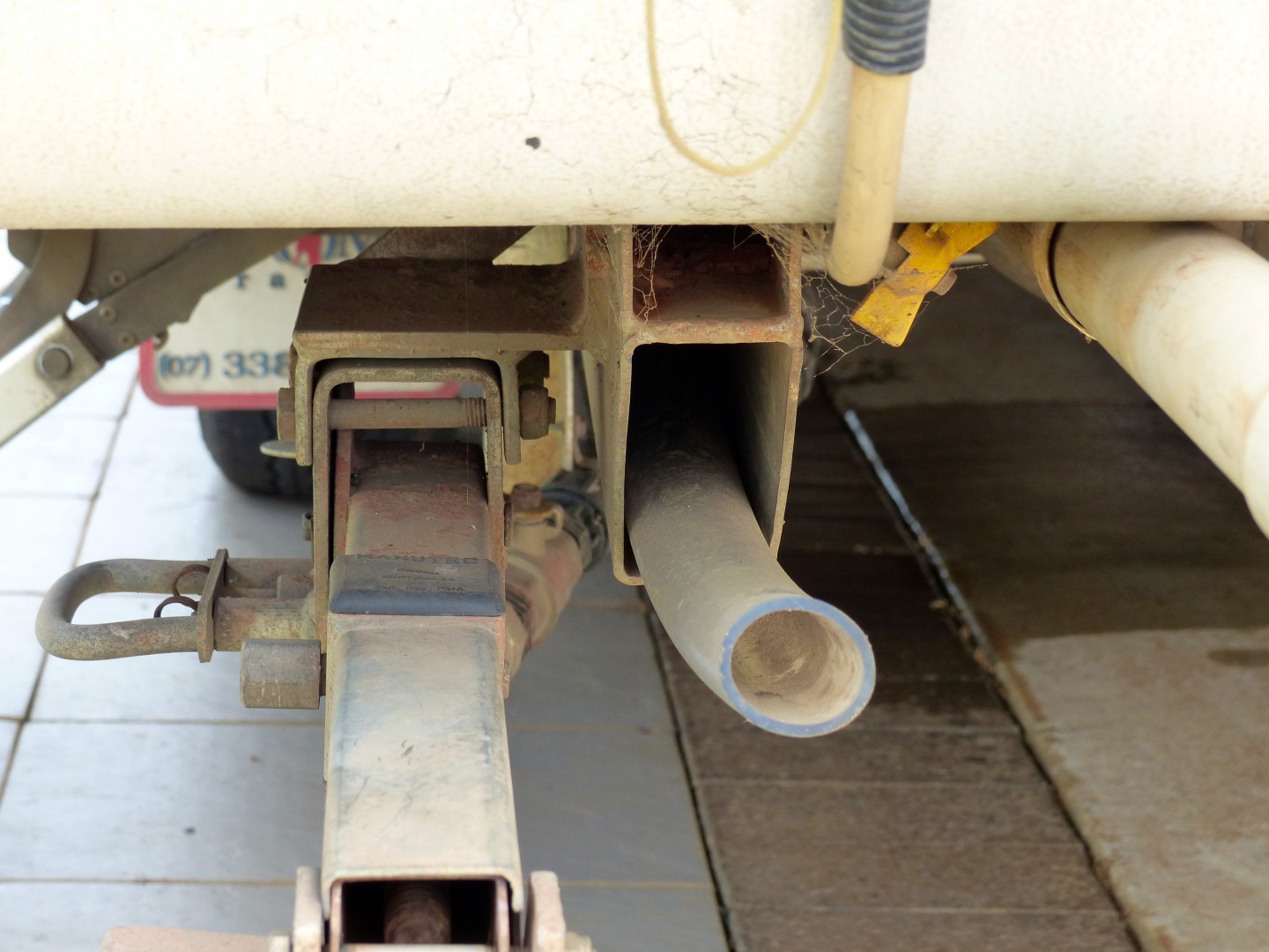 So tried using flexible suction pipe used on firepumps, simply fastened it to chassis rails with cable ties with a few gentle curves around obstacles. Sullage hose feeds in quite easily but firmly enough to stay put when travelling.