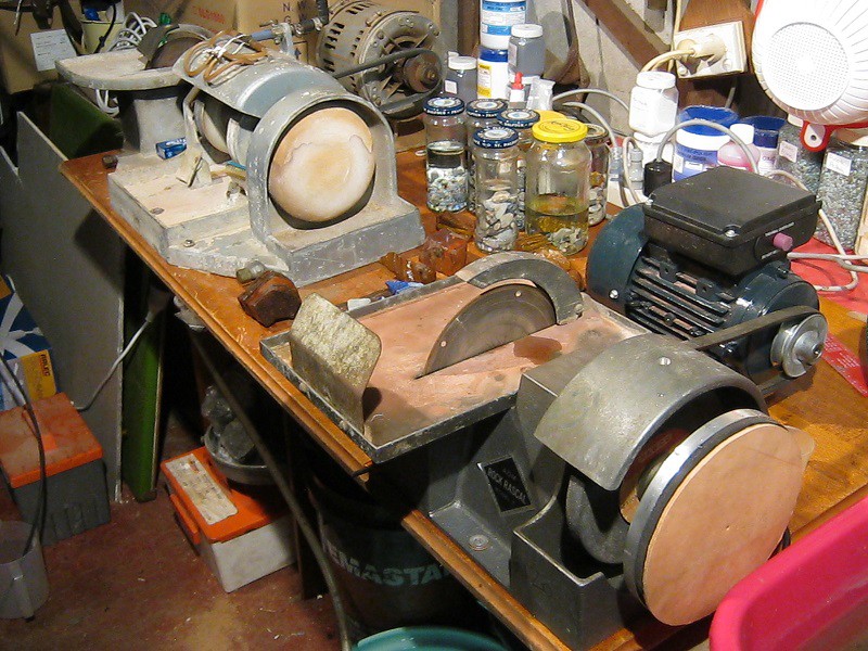 Nice setup. I have a similar setup plus a small tumbler and a faceting machine. Pretty much covers it. I converted the desktop faceter to a portable setup which runs on 12 volt using an old waeco power pack or direct from a battery. Nice to know there are others with the same hobby still.