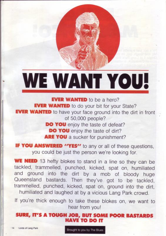 To add balance it ends on an article on NSW titled "Feelin' the Blues" Including a picture of Wayne Pearce who "couldn't face another SOO series & declined to attend this year's festivities"