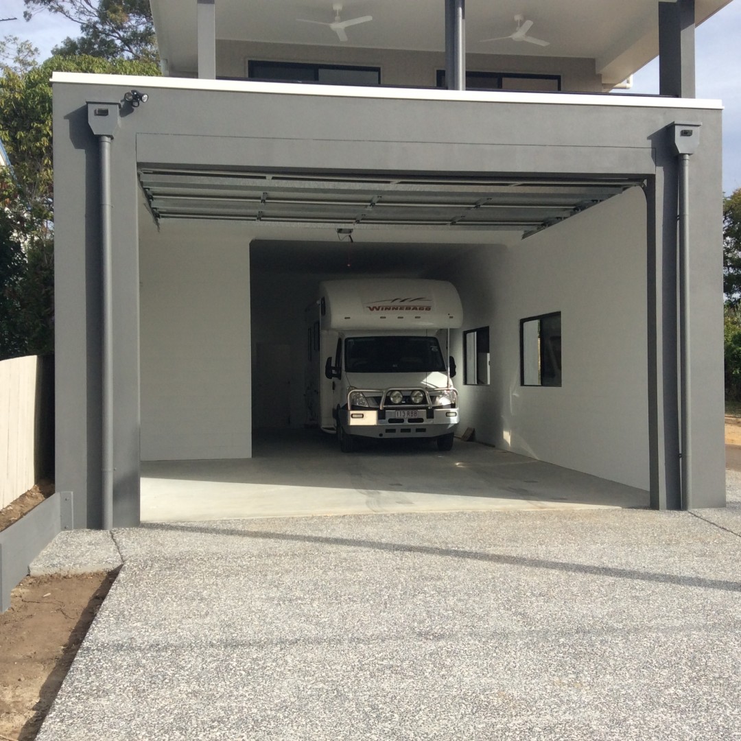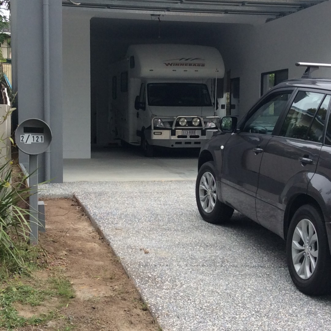 just received the keys to our new downsized home. Gone from 2400 square metres to 400 square metres. The point of interest for Grey Nomads is that it was designed to fit our Winnebago Esperance undercover behind the 2 car garage. Clear height is 3250 mm.