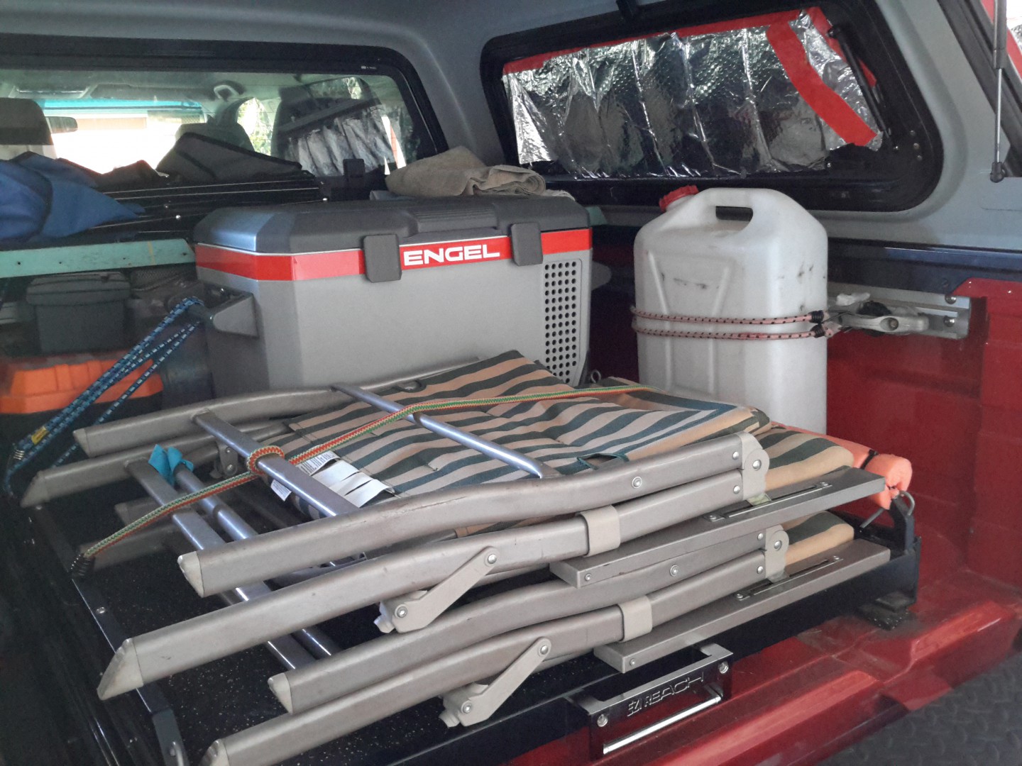 The photo with the heavy camp chairs, Engel frig, a 2nd battery in a portable box, the big plastic box has all my 4x4 gear, 20 litre back up water container, portable light weight chairs for those times you need them, a small folding table, a small fishing tackle box, air compressor, a solf bag of tools, small box of electrical gear. I am able to lay some flat things on ute floor like the axe, small crowe bar, fishing rods, cross cut saw.