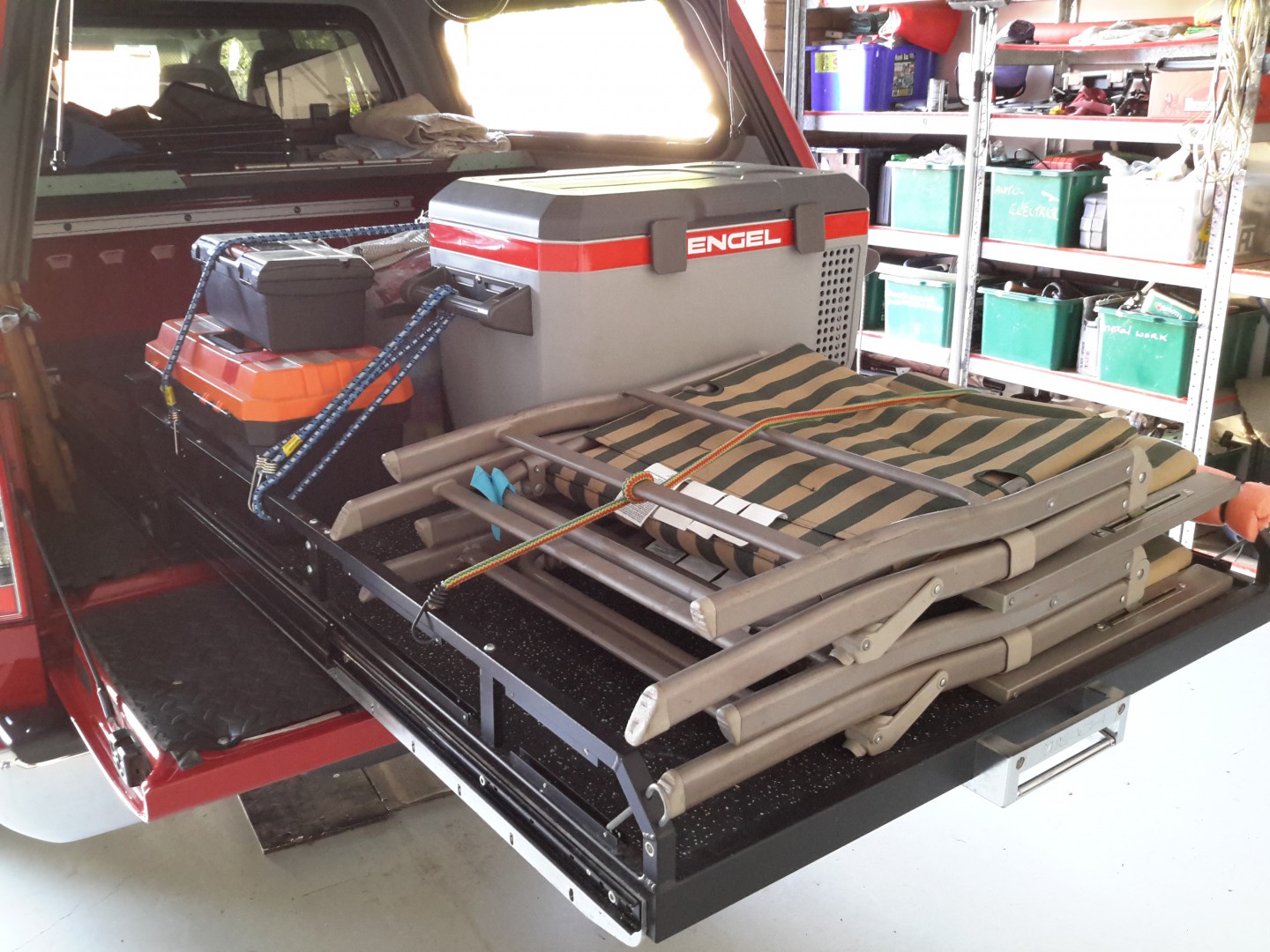 The pull out ute slide was purchased shortly after buying our new ute, the years had caught up to my weary bones and I had serious trouble putting heavy items and then retrieving things from the front of the ute area. Answer one bute ute slide.
