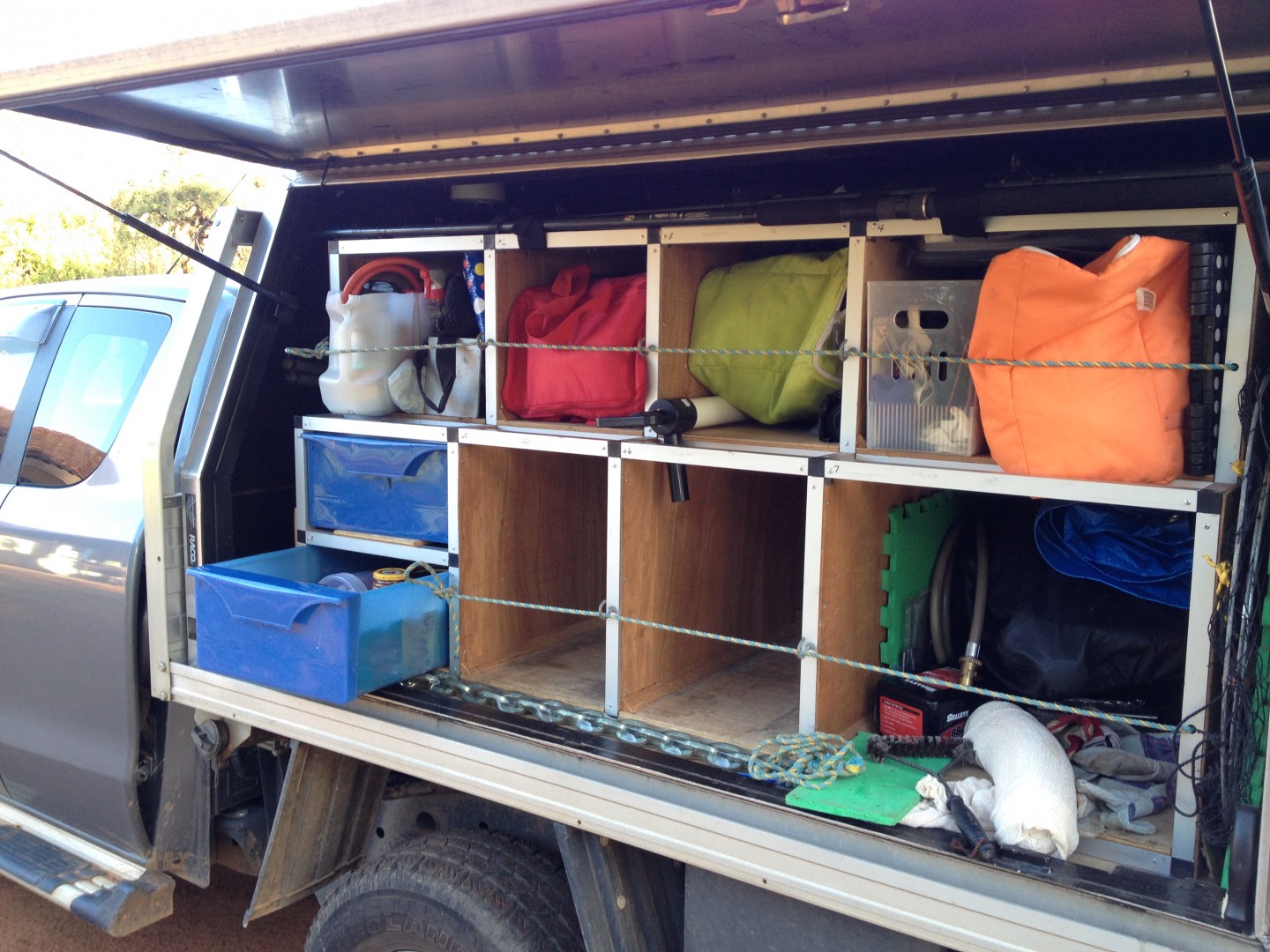 The shelf up the front is bit of a joke as in our previous ute we had a full slide out draws and we would throw light items on top of this but opted not to go this way as most gear would be in the caravan, what happen was they were having a clean up in our area, I spotted this narrow sheet of chip board at the curb, a little adjustment and now its a parcel shelf where some light stuff now live. Very handy.
