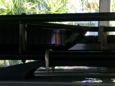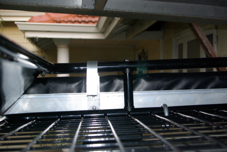 There are three deep hooks on the awning - the centre one set a little higher than the end ones to offset somewhat the downward direction of the roof basket. To position the awning the middle hook goes near the front of the basket and the required back hook near the back of the basket. Again the original fittings assumed that the spacers between the basket bottom and top were solid plate and could be drilled through, whereas on this basket they are hollow tube with a bolt through and cannot be drilled through. By having three hooks and using two to fit it can be hung on either side. The awning is stored in the ute canopy when not being used. I just need to add either some pipe insulation to the hooks or a split plastic pipe over the top rail to stop scratching and also paint the U bolts black to match the basket.