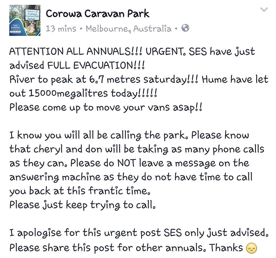 We were in a Moama park in 1993 when we had to move out fast .The water rose to a level 3.5 mtrs above our ground level thats 12 feet in proper lingo .We waited 7 weeks before we could return . We had to leave 4 times in the 34 years we stayed. The Ins co now tells all mobile home owners to leave them in place as they are not insured when left in a paddock etc !