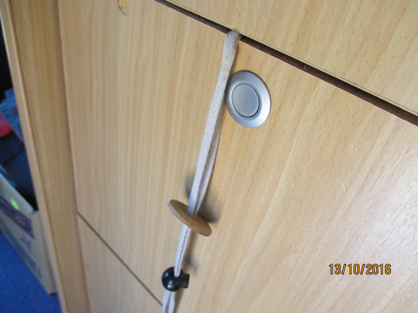 Drawers were another problem. I replaced one broken lock with a cupboard "U" catch but the constant movement sees me constantly tightening the screw which now has been replaced with a bolt. Still not 100% satisfactory, so I found a couple of bottle caps into which I drilled a hole then using a bootlace and the cap that seemed to work but now I have replaced the bottle cap with a 3-ply disc, shoelace and toggle (from a hat).
