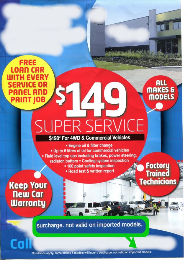 I can't see why the cost to do a service on an imported model is any different from doing one on a locally built model especially as the only parts that they will be using are oil filters, oil and possibly some fluids. The locally built models are probably covered under the conditions and surcharge bit so no one actually ever qualifies for this price anyhow. I don't know if they think consumers are dumb or if they are just counting on people not reading the fine print until they are handed a bill for $300 or $400.