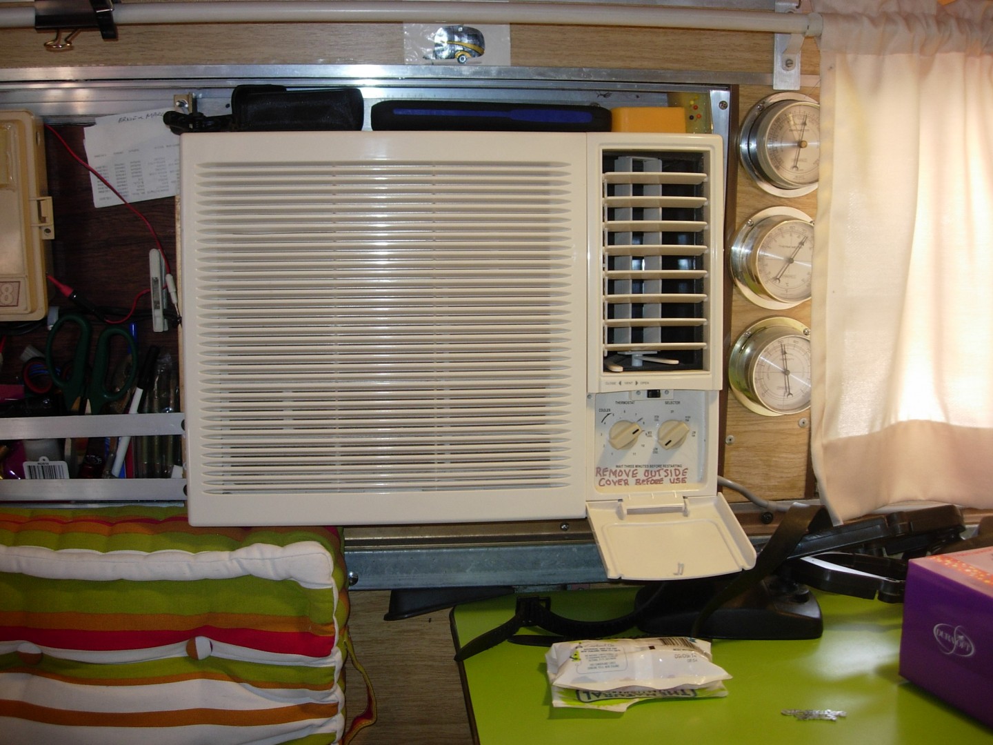 With our last van , an 18'Viscount Pop Top, I carried a portable A/C in the summer months.( still use it here in my ''office - cave '' ) I made a vent extension that fitted into one of the zip up openings in the pop top and has polystyrene panels that fitted neatly between the roof and the main frame with small windows cut out on them for ventilation, light etc.