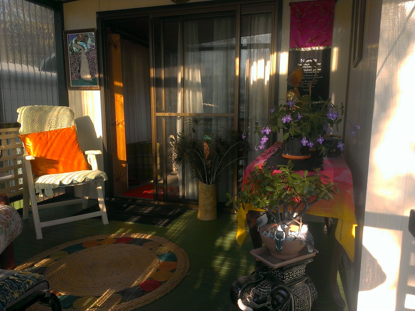 Covered carport has room for two small cars. Also,a 3 x 3mshed and a lockable workshop with power, currently used for a craft room.