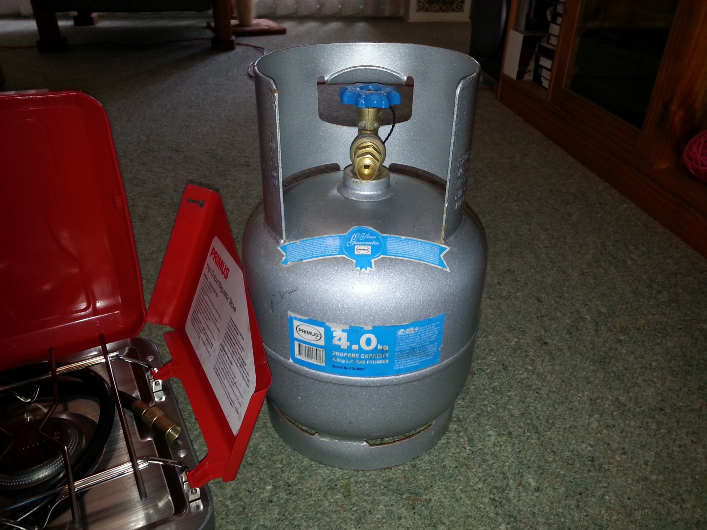 Comes with a Primus 4kg gas bottle, and the adapter needed to connect the cooker to it.