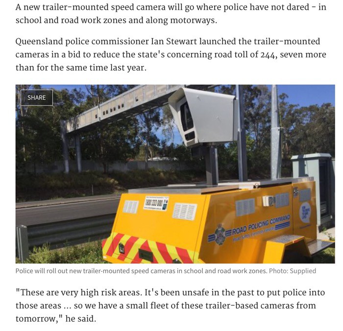 Qld police will be rolling out new speed cameras. These will be placed in road work areas, school zones and other areas. Full story here http://www.brisbanetimes.com.au/queensland/new-speed-cameras-for-queensland-road-work-zones-20161222-gtgdqo.html