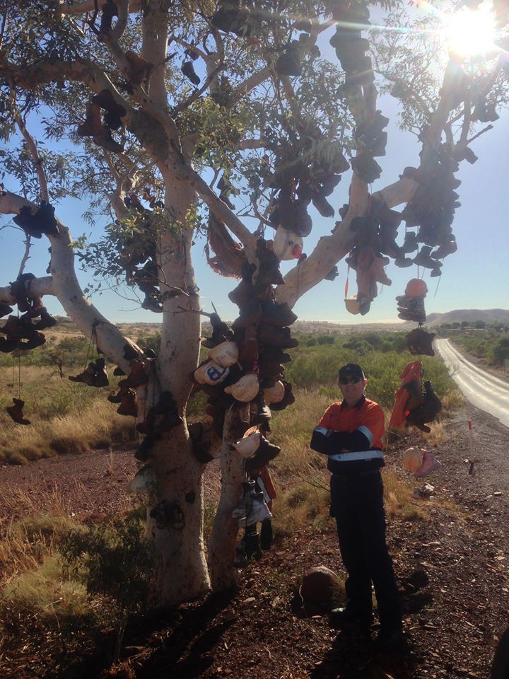 Apparently when the FIFO workers at a nearby BHP Mine site finish working there for good they leave behind their boots and helmets on this tree, in the Fortescue inland river area.