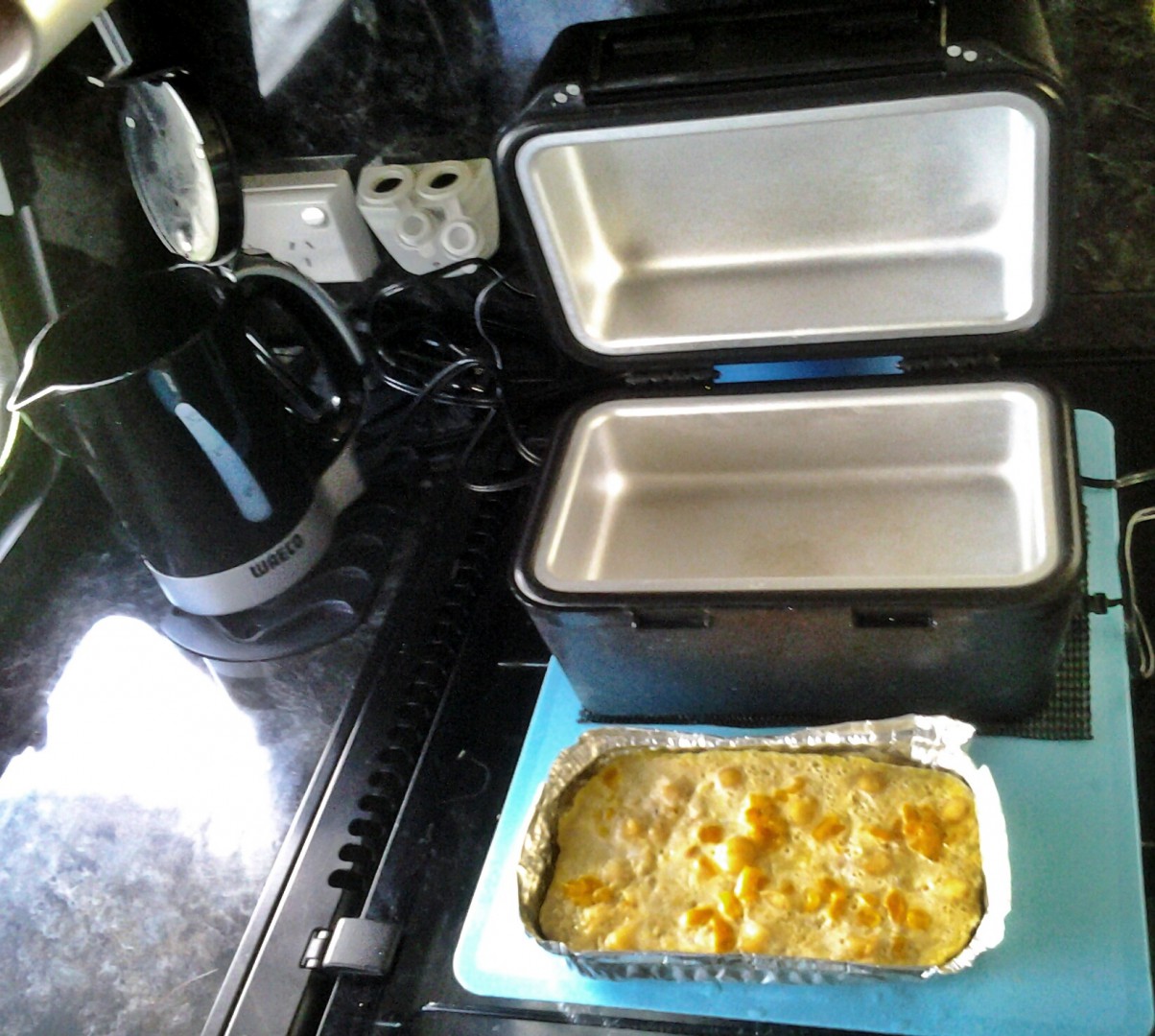 Stainless steel saucepan, BBQ flat plate and the wonderful invention, 12v Lunchbox Oven (which makes anything a slow-cooker can make. Just put food in an oven bag then into the oven).