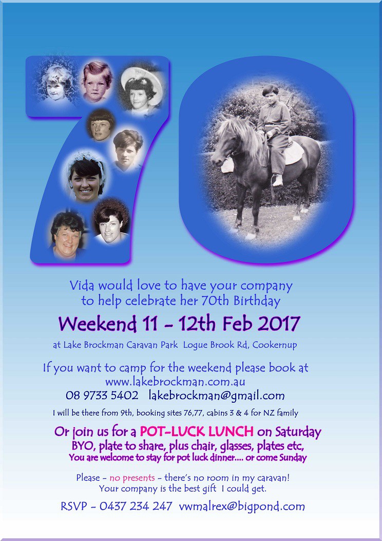 Hi Vida, we couldn't make it, have too much on for the coming weeks. Hope you all have a great party and don't get washed out. Happy birthday for the day. Ian and Jo.
