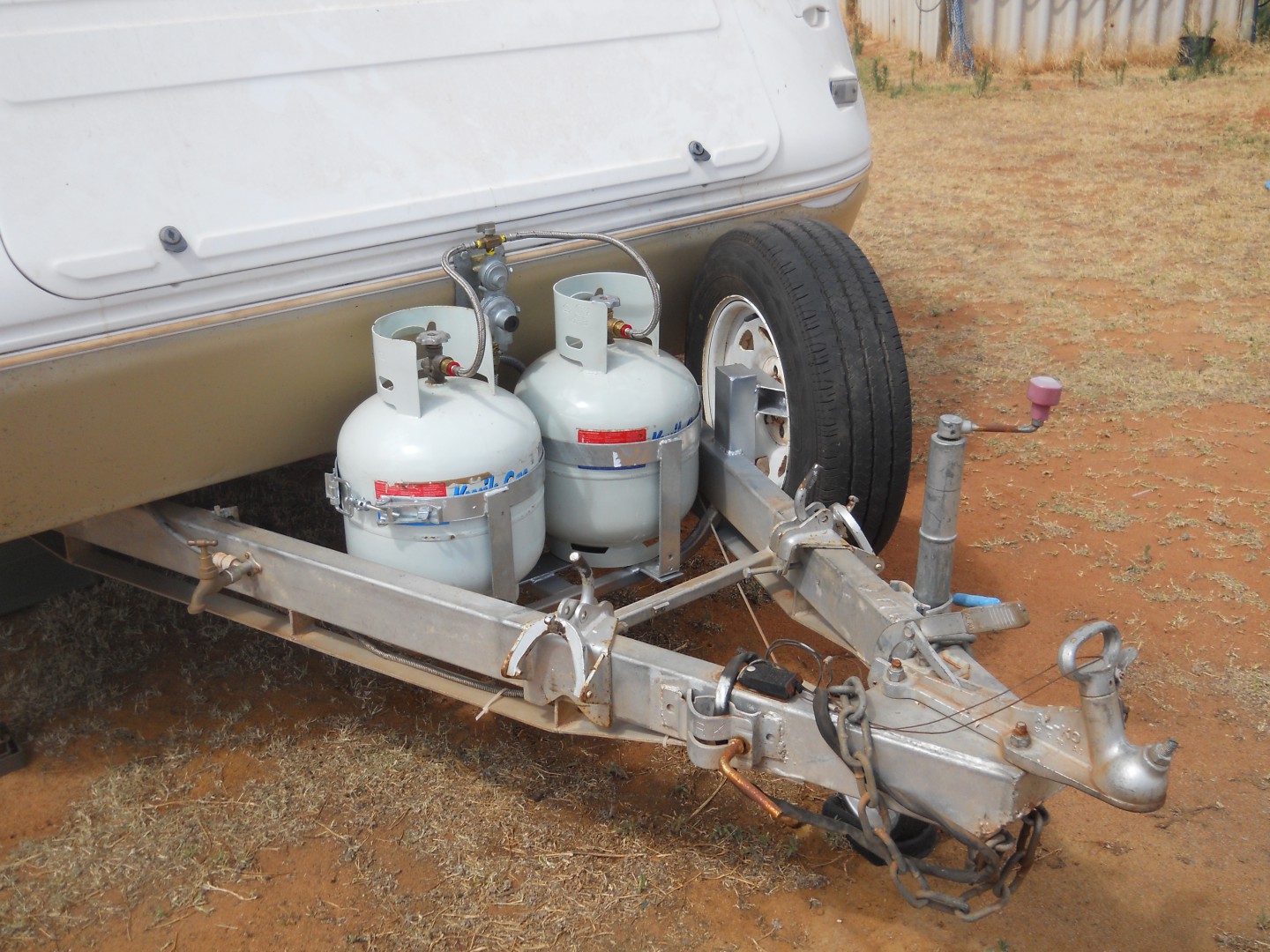 When I ordered our 2000 model Jayco, I asked for a drawbar shorter than standard (to more comfortably fit in our shed). We picked the van up at the dealer in Melbourne, and I backed up to hitch it to my Range Rover. All good, until I had to do a hard turn to the right to get out of the dealer's yard. CLANG! The rear bumper of the tug hit the gas bottle which was mounted on the R side drawbar. First thing to do when we got home was to make up a bracket and relocate the gas bottle to the centre of the drawbar. A simple job really, and whilst I was at it, I put a sheet of Galv steel wrapped in front of the bottle to act as a stone guard. I think that the centre mount actually is more stable and secure than the original position which merely had 2 lugs welded to the top side of the drawbar.