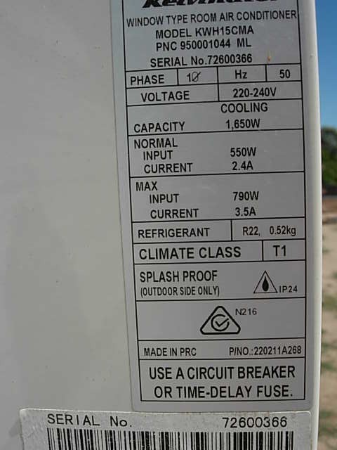 This is a Kelvinator A/C ive fitted to a 12Ft pop top van. It works great even in 48deg C & a 1Kv generator starts & runs it easily. Have made a canvas cover for traveling.