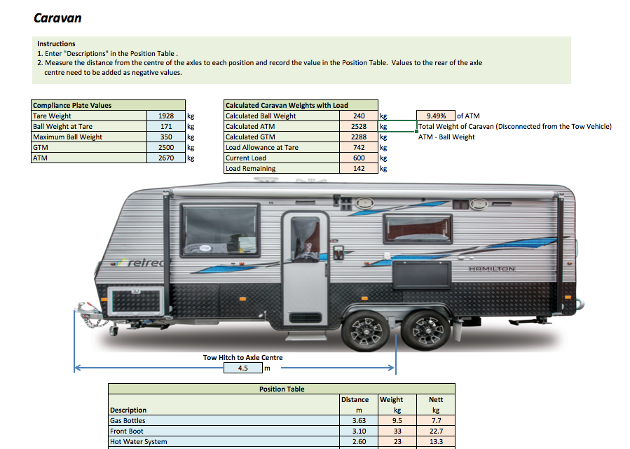I mentioned this a friend on a Face Book Group for Retreat Caravan Owners, (John Halford, a man who has a very good understanding of how to use Excel), if he had considered developing a tool to help calculate loads. He had, and the result is an excellent multi worksheet spreadsheet that allows the user to determine not only the weight of the loads, but even better, it will show what impact on the ball weight placing an item in a given position will have. This is done by taking measurements of the various storage location from the centre of the axle (single or double axle) and using this measurement to calculate impacts.