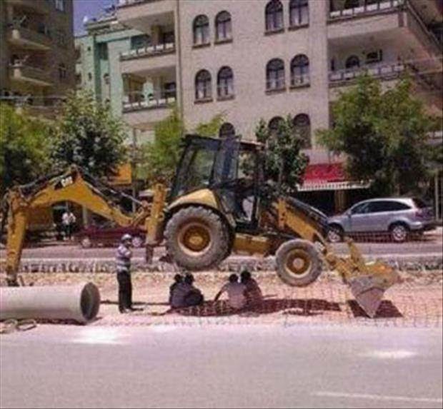 That must be the OH&S guy assessing the situation standing in the sun.Is skincancer worse than being squished under a backhoe?