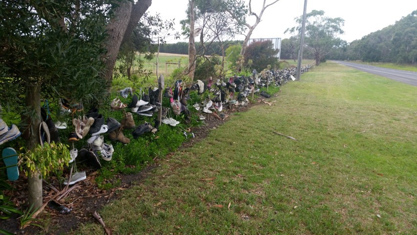 If all these shoes and thongs were lying about they would look extremely unsightly. I think this looks pretty amusing and a good discussion point for those travelling passed.