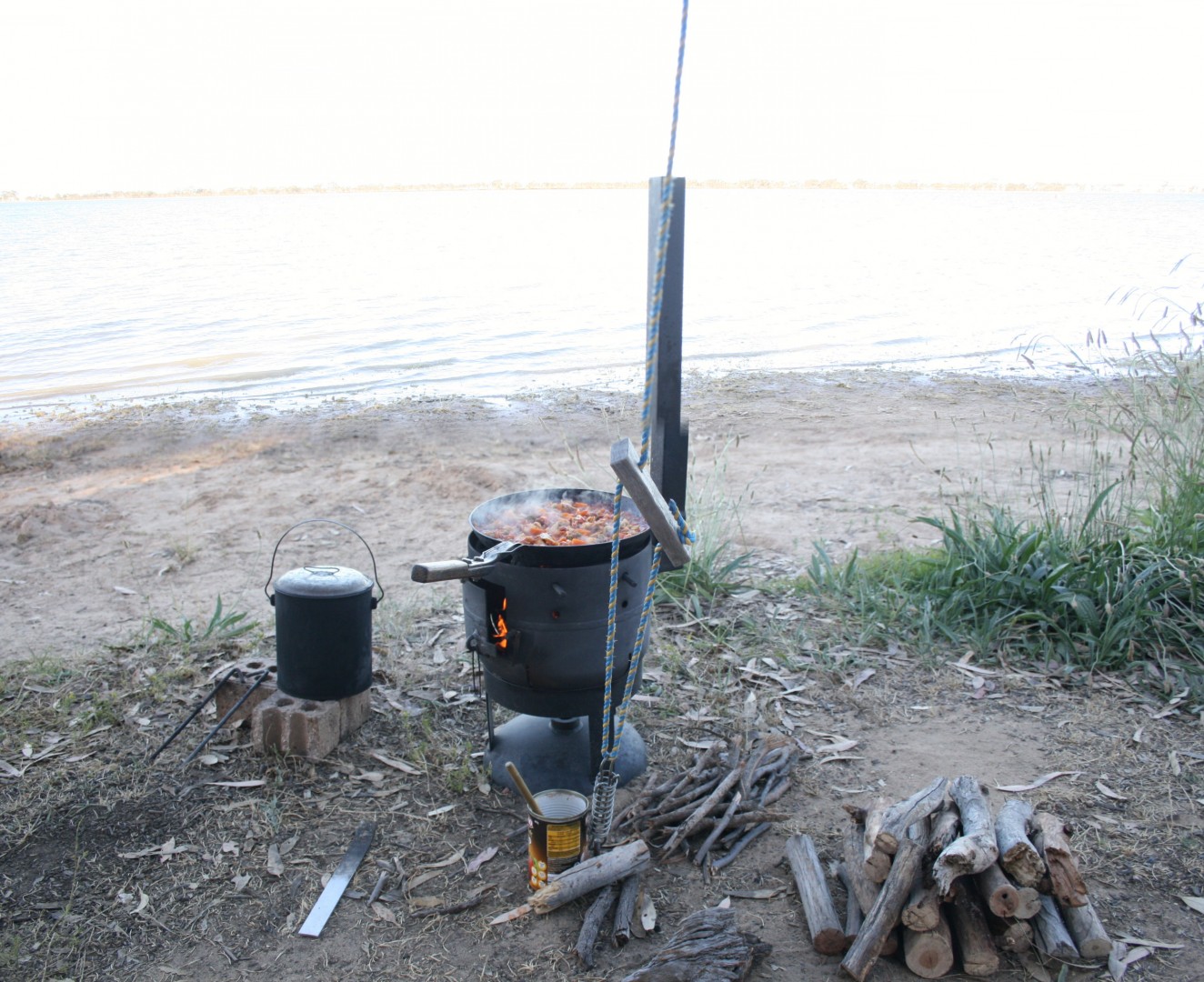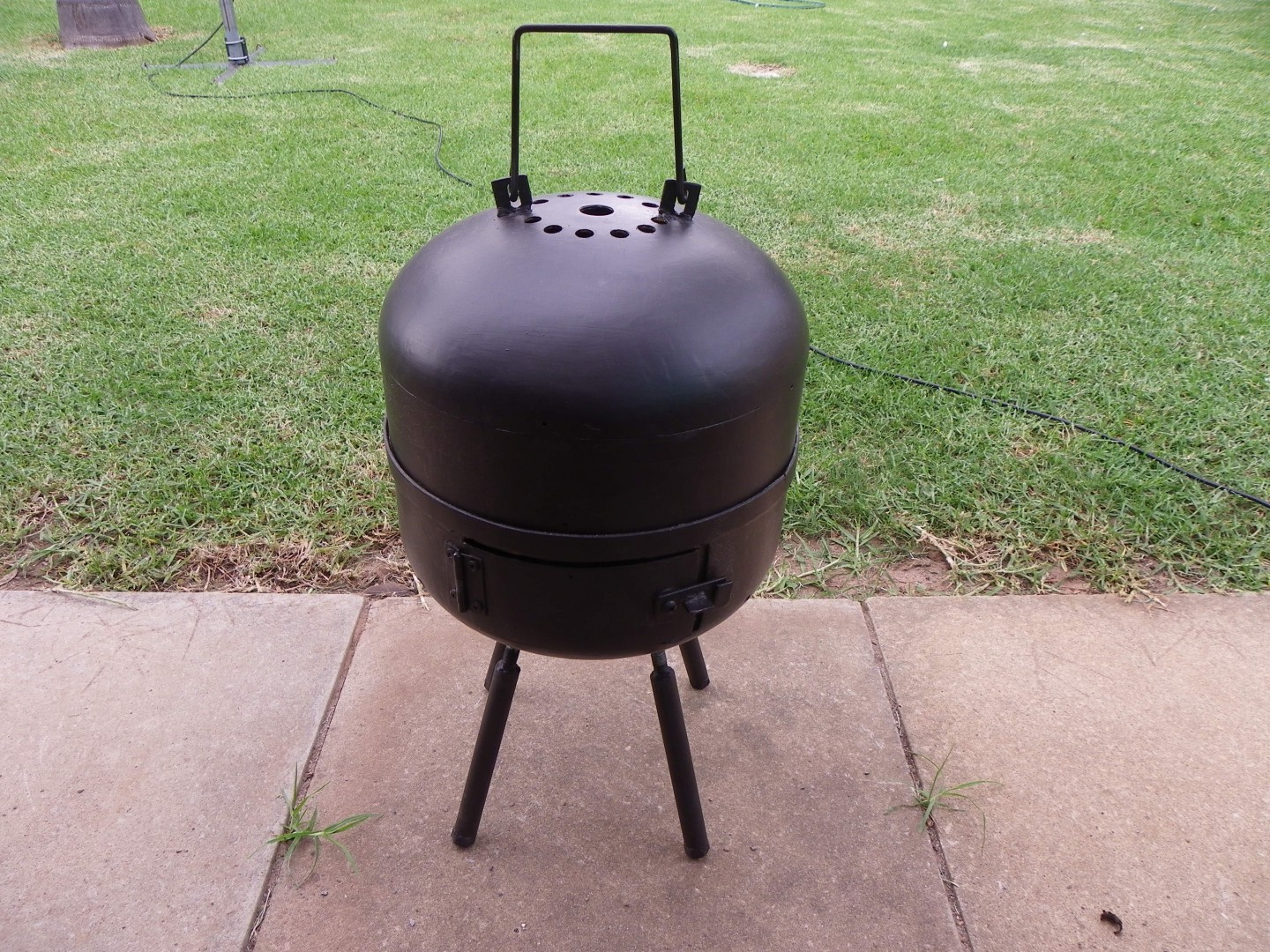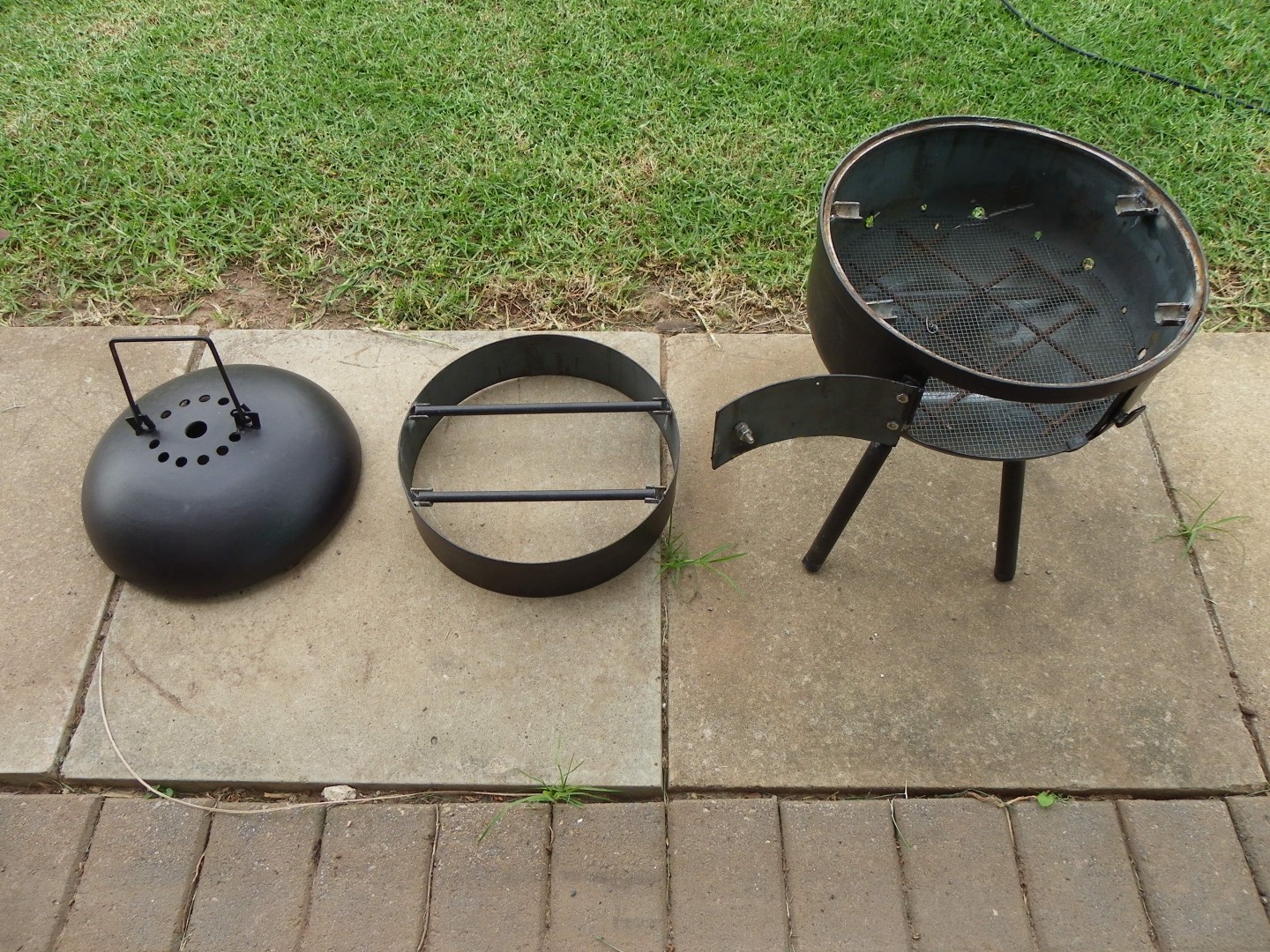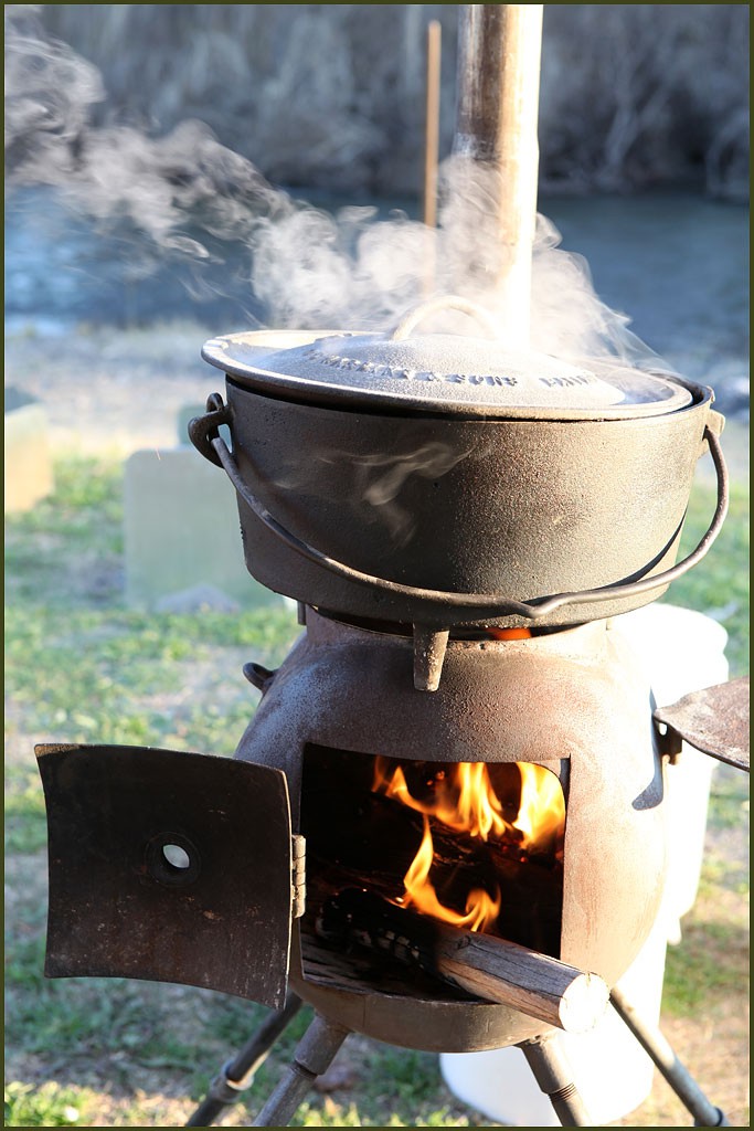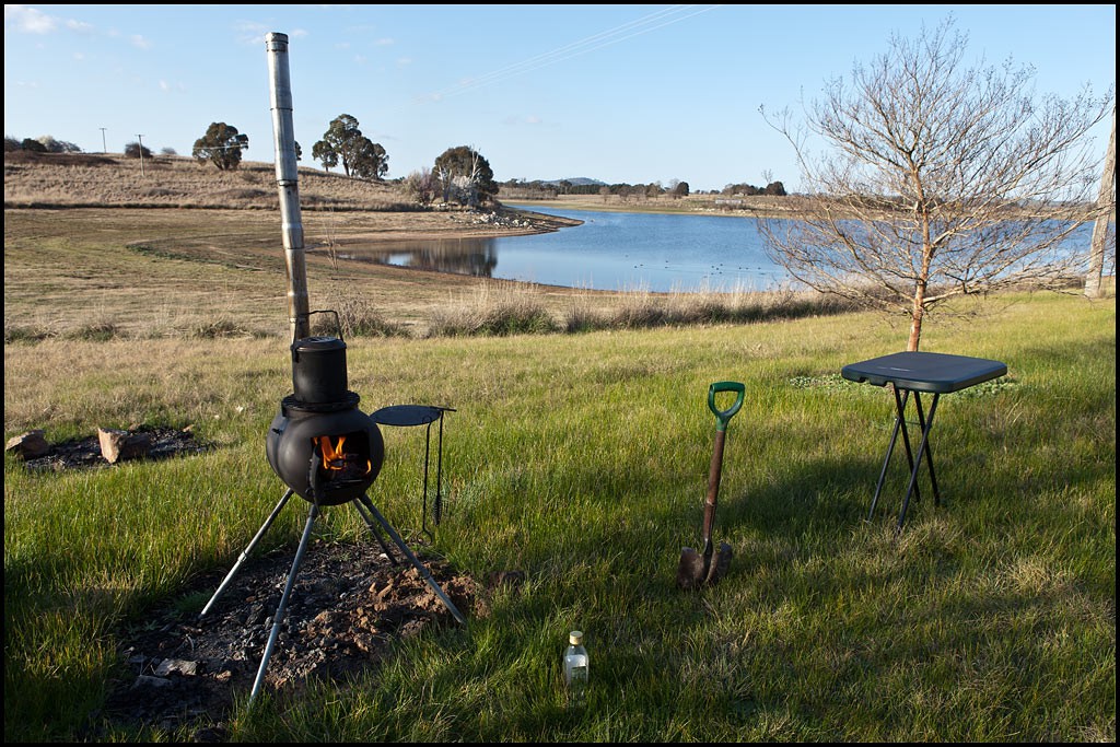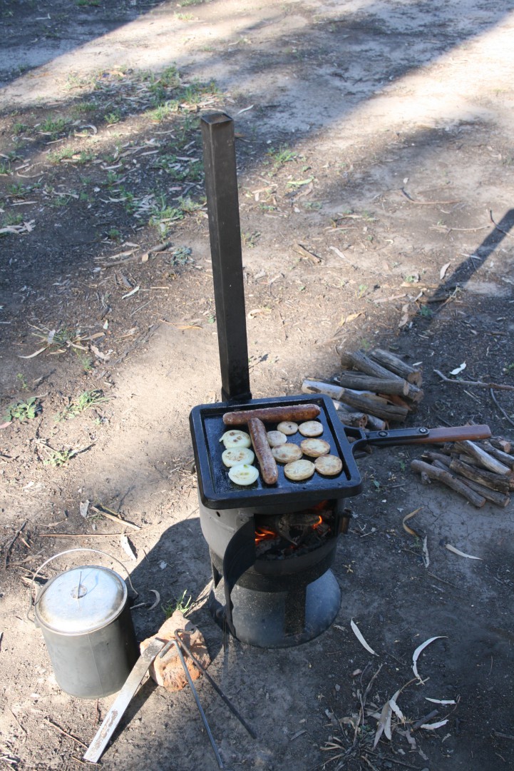 G'day mezza56, This is our cooker. The legs and chimney all pull apart and store inside the cylinder. There is a mesh grill on top or a solid plate when we want to use it just for warmth. We made a square door as it allows a double jaffle iron to pass through it. If you go this style make sure you use a 2.5" to 3" pipe for your chimney so it draws well. Happy travels.