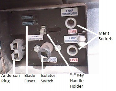 The two pole grey/white item at the bottom left is an Anderson connector and is *probably* (check before plugging anything in to it!) for an external battery charger.